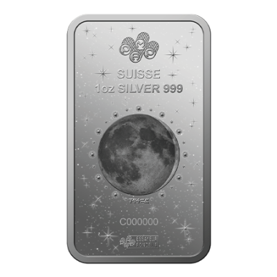 The reverse includes a lunar-themed pattern with a full moon, stars, weight, purity and a unique serial number.