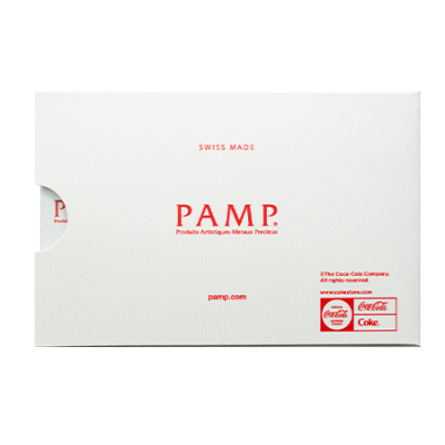 The obverse carries the PAMP Suisse logo along with weight and purity details. The reverse displays the Coca-Cola polar bears artwork, tying the bar to the brand’s long-running holiday theme.