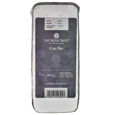 The Royal Mint 500g Silver Bar (cast) contains 500 grams of 999 fine silver and is produced by The Royal Mint. It is marked with The Royal Mint’s logo and an individual serial number on each bar for identification.